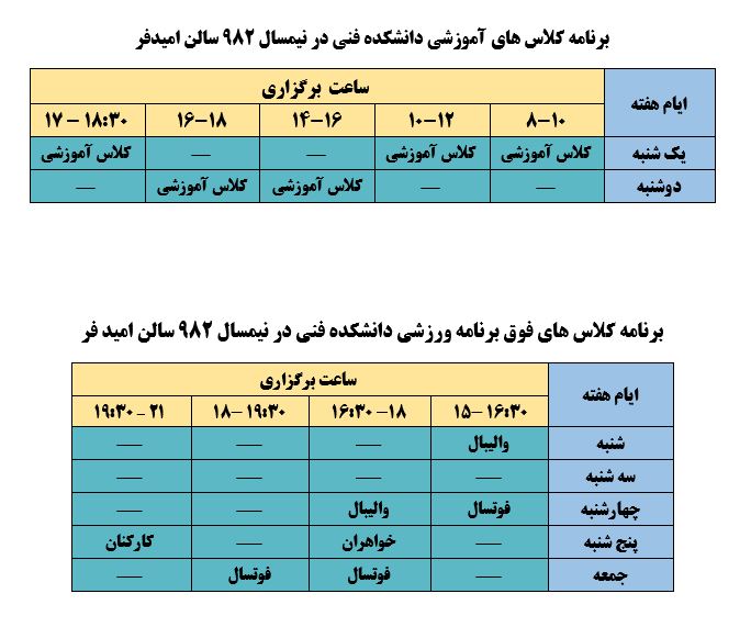 برنامه سالن ورزشی شهید امیدفر در نیمسال دوم تحصیلی 99-98