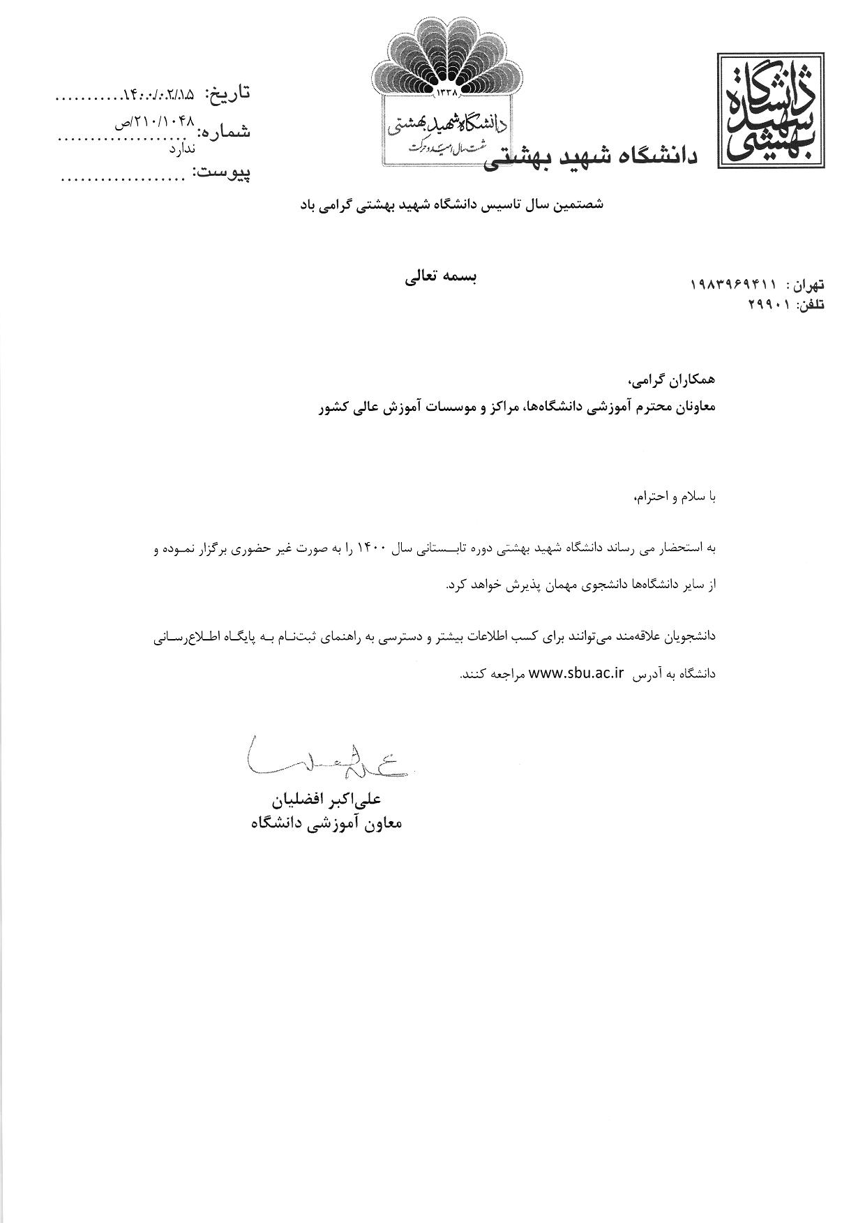 برگزاری ترم تابستانی در دانشگاه شهید بهشتی - دانشکده فنی و منابع طبیعی تویسرکان